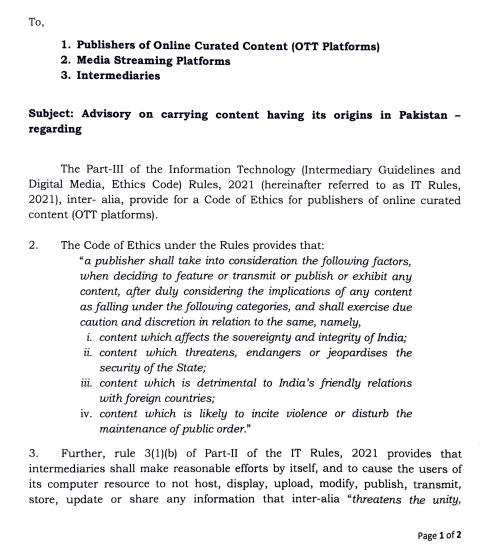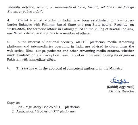 मामले में सूचना एवं प्रसारण मंत्रालय ने मीडिया के लिए गाइडलाइन्स जारी करते हुए सभी मीडिया पब्लिशर्स को निर्देश जारी किया है कि भारत पाकिस्तान के बीच तनाव को देखते हुए कुछ भी प्रकाशित, प्रसारित करने से पहले यह जरूर जांच कर लें कि ये चीजें भारत की संप्रभुता और अखंडता को प्रभावित नहीं करती हो, देश या राज्य की सुरक्षा के लिए खतरनाक नहीं हो एवं भारत के अन्य देशों के साथ मैत्रीपूर्ण संबंधों में दरार नहीं हो। वे यह भी ध्यान रखें कि हिंसा फ़ैलाने और सार्वजनिक व्यवस्था खराब करने वाली खबरें प्रकाशित-प्रसारित न हो या सामग्री शेयर न हो। इसके साथ ही सूचना एवं प्रसारण मंत्रालय ने सभी ओटीटी प्लेटफॉर्म, मीडिया स्ट्रीमिंग प्लेटफॉर्म को निर्देश दिया है कि वे ऐसे सभी वेब सीरिज, फिल्म, गाने, पॉडकास्ट और अन्य सभी स्ट्रीमिंग मीडिया सामग्री को तुरंत प्रभाव से बंद कर दें जिसकी उत्पत्ति पाकिस्तान में हुई है।