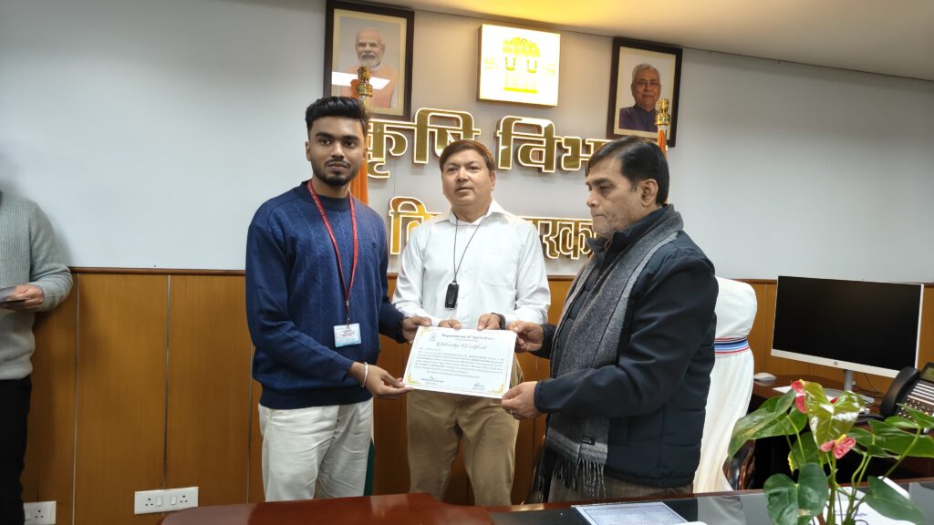 आज कृषि मंत्री रामकृपाल यादव द्वारा कृषि भवन, पटना स्थित अपने कार्यालय कक्ष में बिहार के विभिन्न अभियंत्रण महाविद्यालयों के 20 छात्र-छात्राओं को सफल प्रशिक्षण उपरांत प्रमाण पत्र प्रदान किया गया। इस दौरान कृषि विभाग के प्रधान सचिव, नर्मदेश्वर लाल, कृषि निदेशक, सौरभ सुमन यादव एवं अपर सचिव मनोज कुमार उपस्थित थे। यह प्रशिक्षण कार्यक्रम राज्य सरकार की उस दूरदर्शी पहल का हिस्सा है, जिसके अंतर्गत तकनीकी शिक्षा प्राप्त कर रहे युवाओं को व्यावहारिक अनुभव से जोड़कर कृषि क्षेत्र में आधुनिक तकनीक, नवाचार एवं ई-गवर्नेंस को सशक्त किया जा रहा है।