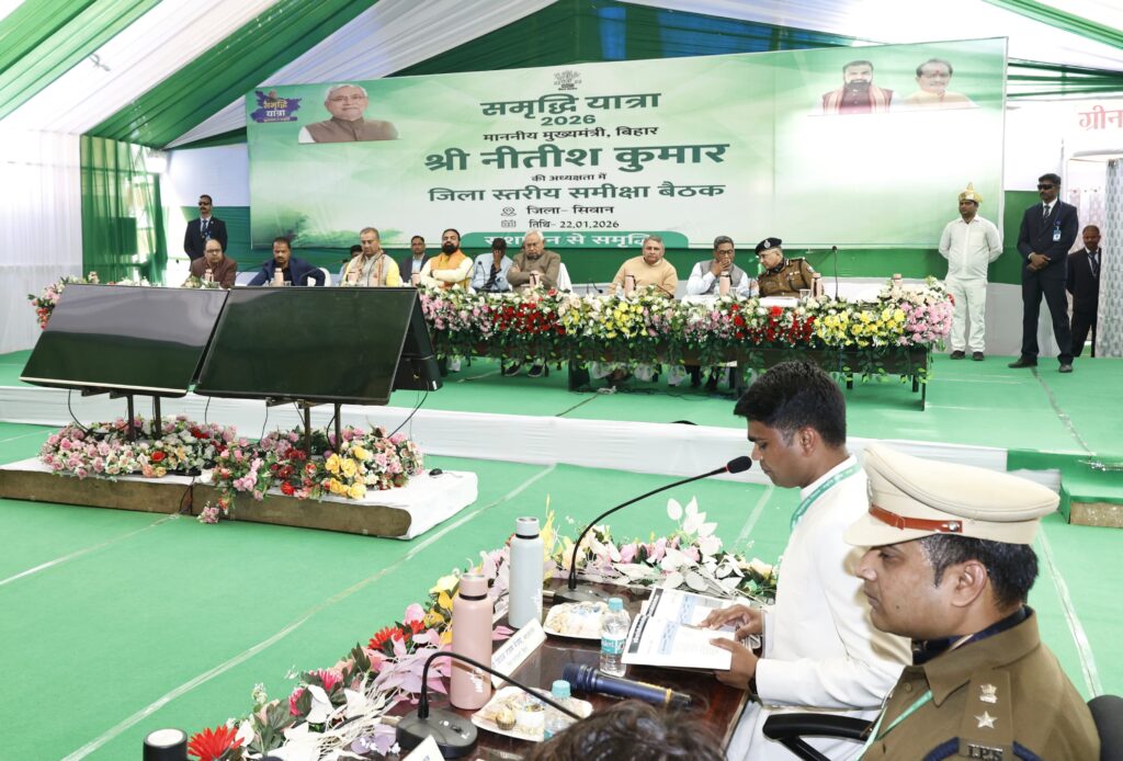 पटना, 22 जनवरी 2026 मुख्यमंत्री नीतीश कुमार ने आज समृद्धि यात्रा के क्रम में सीवान जिले में विभिन्न विकासात्मक योजनाओं का जायजा लिया। इस दौरान उन्होंने अधिकारियों से प्रगति यात्रा के दौरान की गई घोषणाओं के क्रियान्वयन के संबंध में जानकारी ली और कार्य तेजी से पूर्ण करने का निर्देश दिया। जायजा के क्रम में मुख्यमंत्री ने राजकीय चिकित्सा महाविद्यालय, मैरवा में नवनिर्मित सुविधाओं का निरीक्षण किया। इस दौरान राजकीय चिकित्सा महाविद्यालय, मैरवा के प्रांगण में सीवान जिले की 202 करोड़ रुपये की लागत से कुल 71 विकासात्मक योजनाओं का रिमोट के माध्यम से शिलापट्ट अनावरण कर उद्घाटन एवं शिलान्यास किया। इनमें 157 करोड़ रूपये की 40 योजनाओं का शिलान्यास एवं 45 करोड़ रुपये की 31 योजनाओं का उद्घाटन शामिल है।
